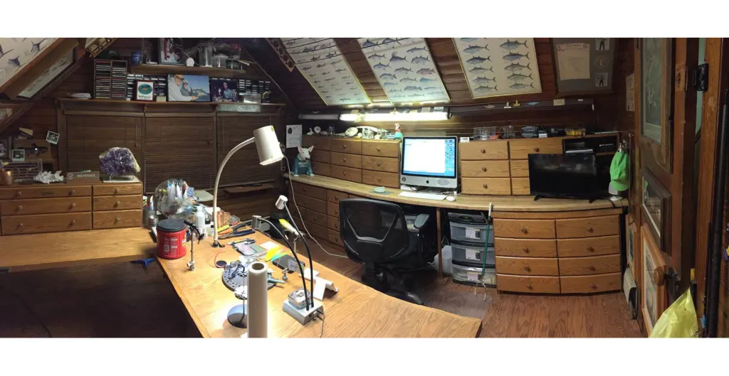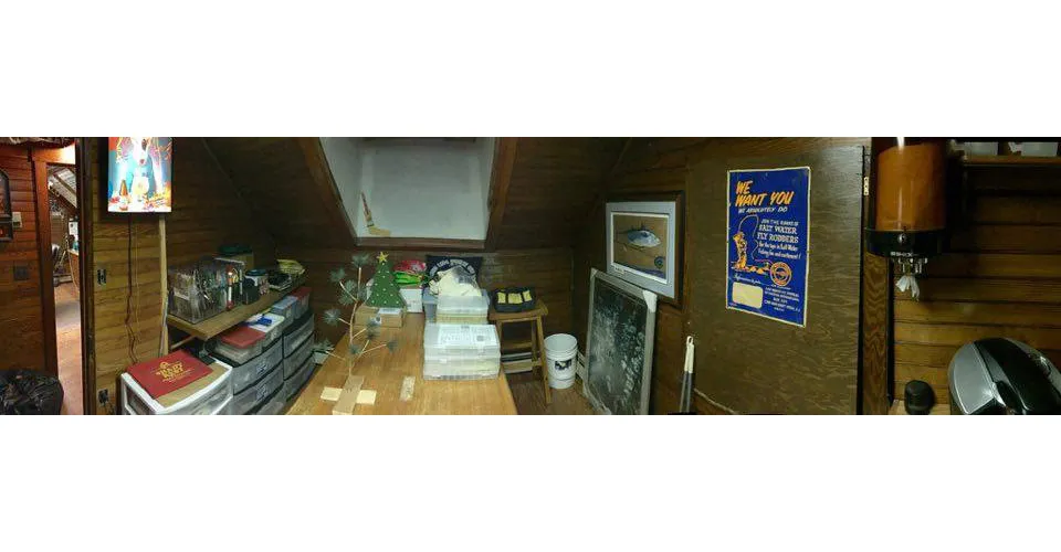 The birthplace of a lot of innovative fleye designs. Bob writes "Tying room is designed to hold my tools, hooks, eyes, TUFFLEYE, and LIMITED materials. I use a small box to hold materials I will need to do certain type FLEYE. You can see it on the table. Keeps a mess to a minimum. Some BUCKTAILS, feathers and flash are located in large drawers along the wall. Computer, tv and video equipment along wall also. Storeroom holds all the bulk of materials. Fishing equipment, bags, luggage, etc. coffee machine, little fridge (not in room yet), lots of books. BTW, forgot to mention rods along the ceiling and in slots along a wall and in hidden cubby holes."