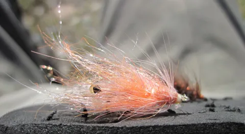 Body SLF Saltwater Dubbing color: fluo shell pink and Spirit River Lightnin Dub, color: sand shrimp, in dubbing loop Aura style (see text)