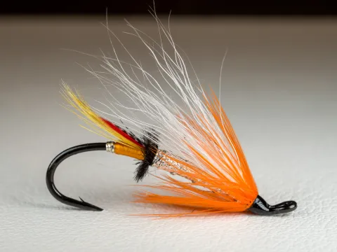 | Tail | Golden Pheasant Crest, veiled by red hackle fibers and barred teal |