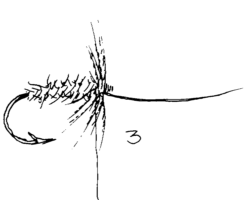 I turn the hackle, tie it down and wind the thread through the wound hackle and finish with a couple of half-hitches in front of the hackle. This last procedure can be something of a problem, when we as the custom is to-day have our thread on a bobbin-holder.