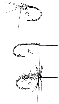 To come even closer to the old drawings in the books I wound the thread at the start to the very tip of the hook - covering it totally. To make it more even I turned the hook in the vice and turned the thread in the opposite way around the hook (a) Then I turned the hook and wound the thread to the very end of the shank - giving the turns a coat of thin lacquer before I continued. Then I placed the gut under the shank and tied it down with 3-4 turns of thread to the rear - then tied the hackle down as mentioned above...