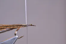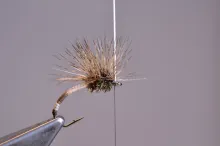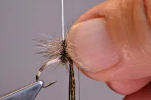 Pull the parachute over the thorax. If you pull the post tightly forward, the fly will sit higher on the water than when you leave a small space between the hackle and thorax. Tie the post down behind the hook eye. Avoid trapping any hackle barbs: use the post as a guide to slide your thread wraps in place. If you do so, the thread pressure alone will push back any stray hackle barbs.