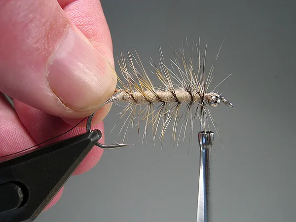 Wind the hackle in 6-8 turns to the rear of the fly.