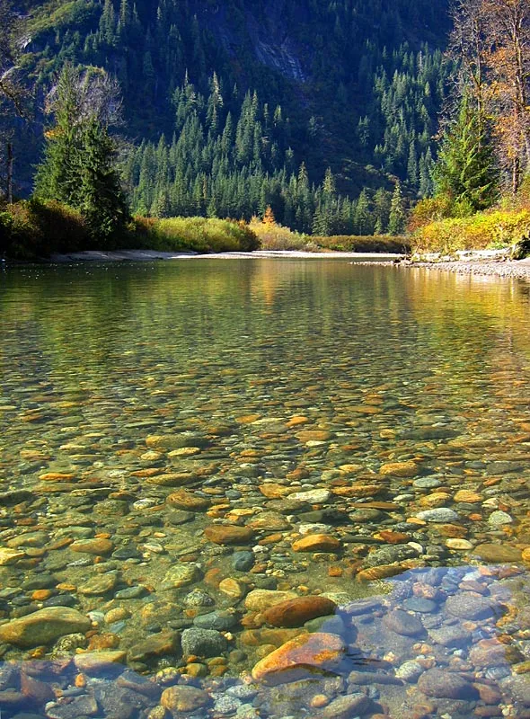 The dark mountainside reflecting in the water makes it look even clearer. Notice how the least bit of sky (lower right) immediately gives glare.