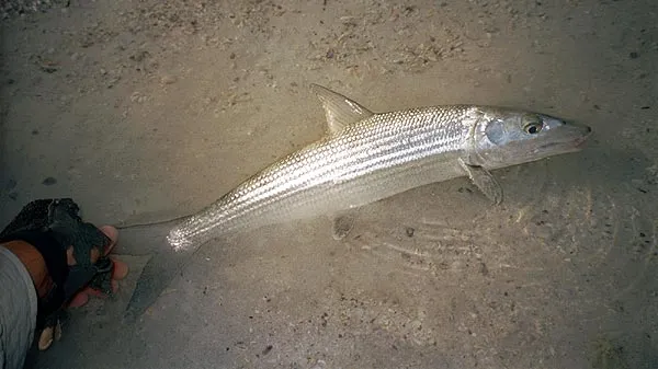 The pre-release picture of a 3-4 lbs. bonefish clearly shows most of it's external morphology: silvery scales, distinct dorsal fin and tail, flat underside and very large eyes.