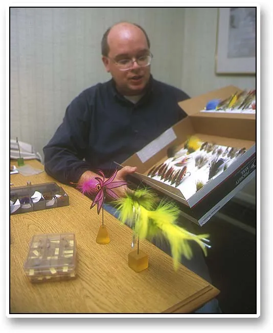 Bob Petti with his boxes of flies organized for the FlyMeister 2001 contest.