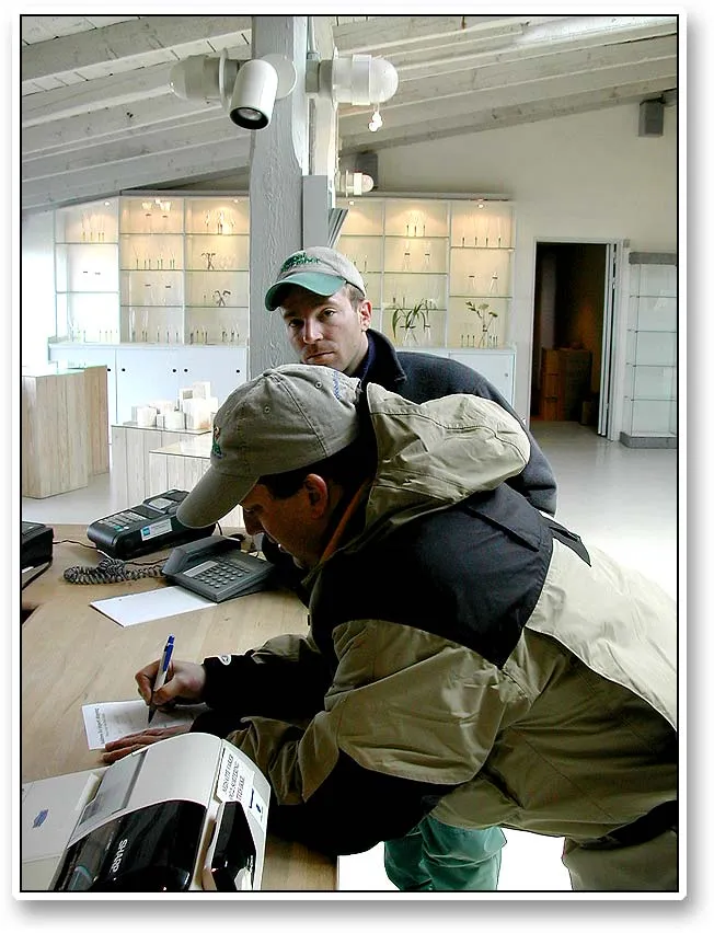 It has become a tradition that we visit the Baltic Glass glass shop and buy a few souveniers. Steve signs the check and Sean watches anxiously.