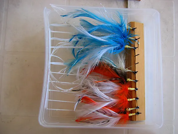Lars kept his tarpon flies ready for action in this simple box, factored from an old candy container. As you can see he tied his flies in both blue and red variations.