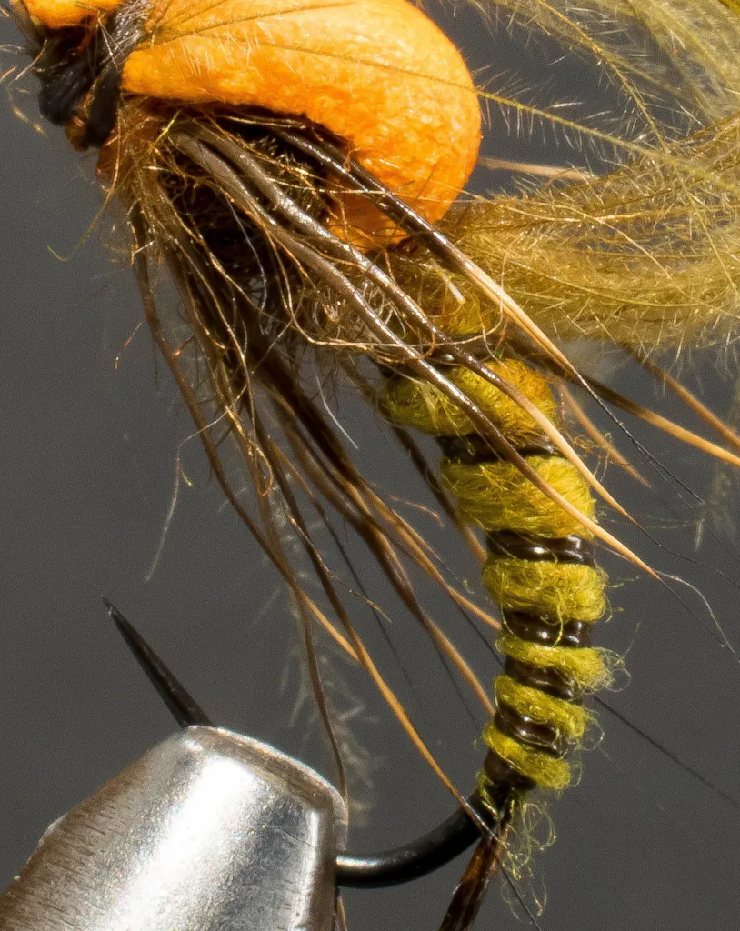The CDC Loop Wing Foam Emerger close-up, showing body/rib, legs and part of the CDC and foam wing.