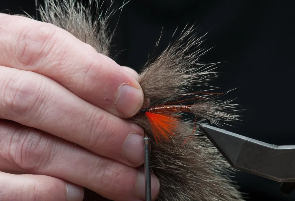 Select another slightly larger bunch of silver fox. The hair length is again 1½ the hook shank length