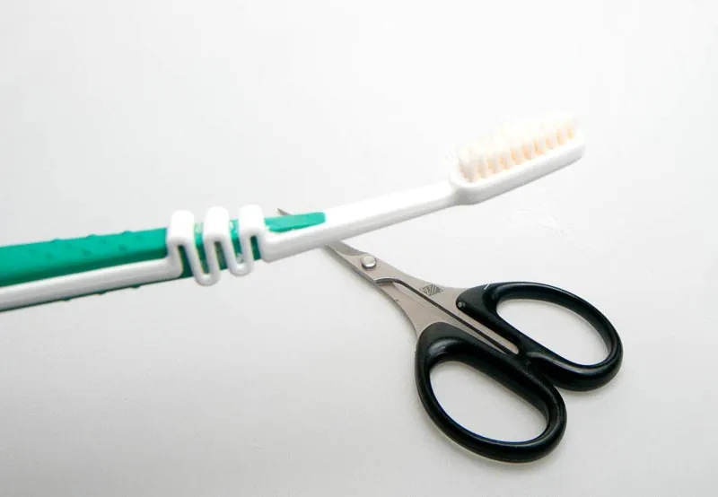 I used a pair of old serrated fly tying scissors to cut this toothbrush, but recommend that you use a coarser pair of office or kitchen scissors for the purpose.
