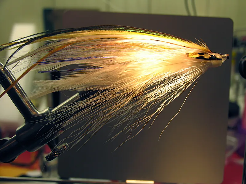 The fly with feathers and herl over the hair wing. This pattern has a jungle cock for eyes and its head is covered with epoxy.