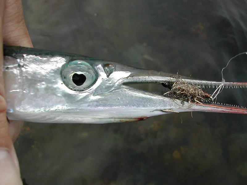 Garfish can be pursuated to take larger flies like this Copper Shrimp, but really small, bright flies size 10-14 are the right choice for these large eyed hunters.