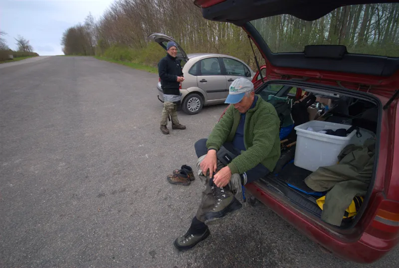 In lack of a comfortable chair, the back of a car can provide a seat and a little dignity while getting out of the waders.