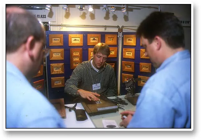 The fabulous glassmaker whose name escaped us all talking to GFF partners Bob and Steve. We were right across from his booth and were all fascinated by his craft.
