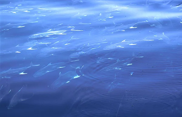 This is a school of jacks in the 10-15 lbs. range that turns just under the boat after Lars has tried to get one of them to take a fly, which they would follow closely until just under the rod tip. Quite a thrilling experience!