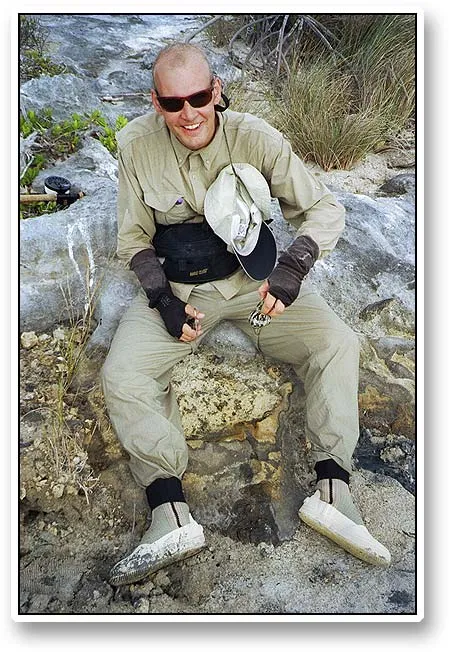Joachim toting a complete wading outfit from the stylish Simms flats wading boots to the not-quite-so-stylish modified socks that he used to protect his hands from sun and line wear.