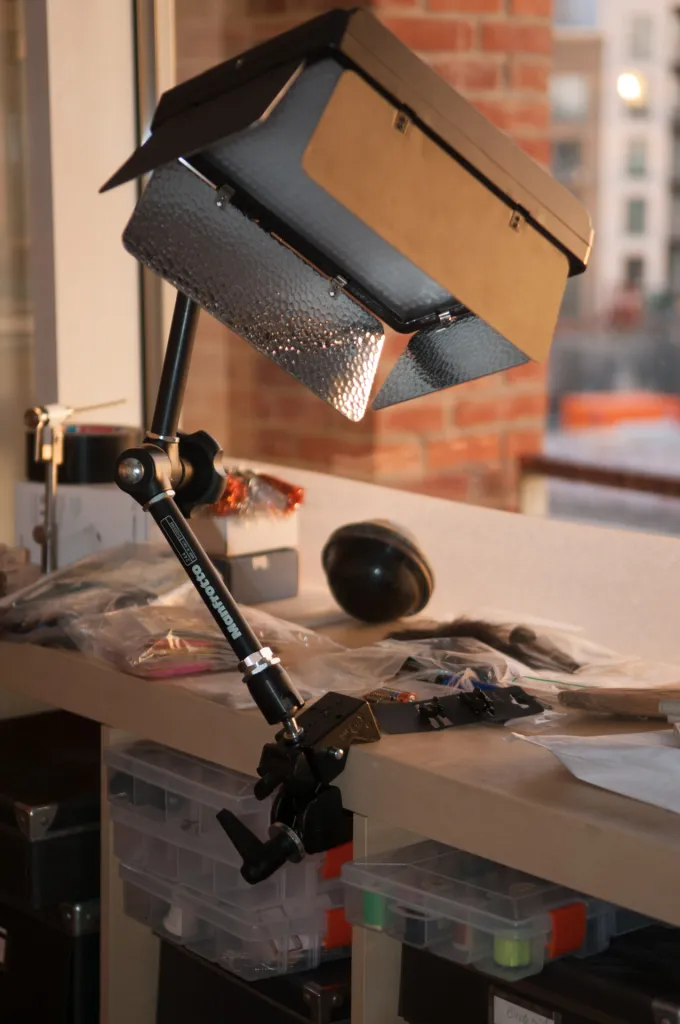 The larger LED panels require some hefty hardware to hold them. I use a Manfrotto Friction Arm and a Super Clamp.