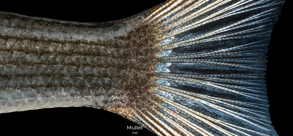 The details of the tail of a fairly small mullet - about 15 centimeters or some 5-6 inches. This image is only zoomed in about one third of what's possible.