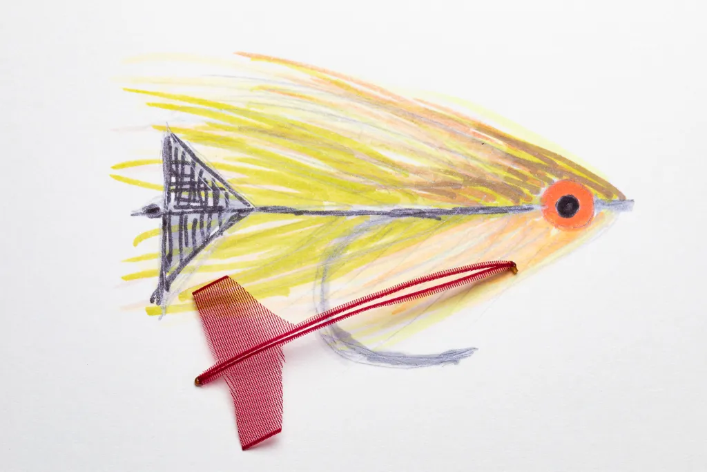 The original concept sketch and an organza tail made from 12mm ribbon.