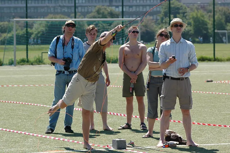 Overall winner Nicolai Eriksen in the #5-weight distance discipline. The author is visible just behind him, second from the left (Jari adds: tortured by the lack of a hat and sunglasses on the first real summer's day and just generally having a bad hair day)