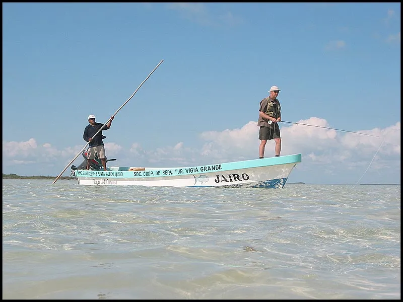 the classical situation: guide poling and angler watching out for bonefish, ready to cast.