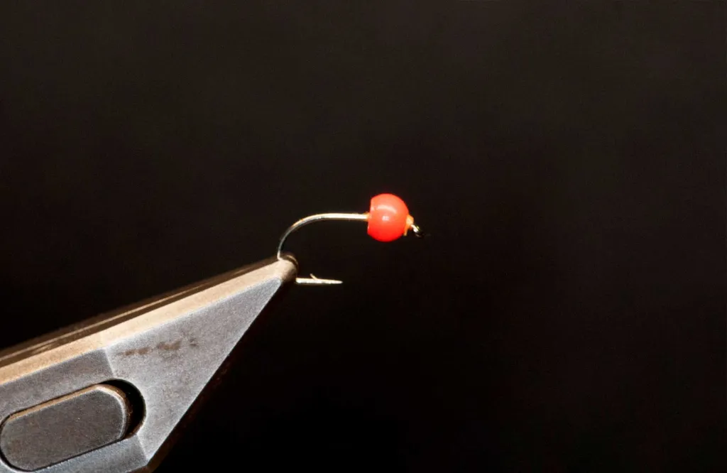 Push the bead in place, all the way up to the hook eye, and let the glue or varnish dry.