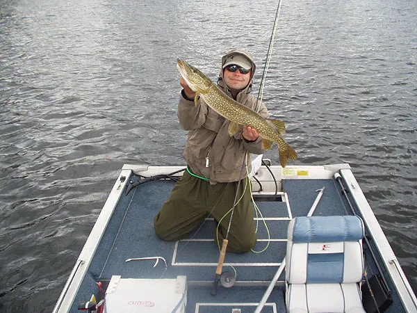 Author's friend Bert Cyr presents a pike on the rear platform of great boat for flyfishing for pike.