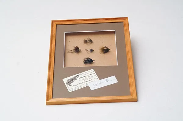 This frame contains five flies tied by the same tyer, who has also supplied a business card and his signature to add to the frame.