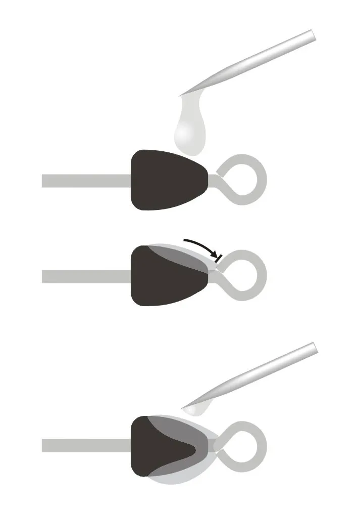 With a rotary vice the varnish is added from the side, and settles in the gap between the tapered head and the hook eye.