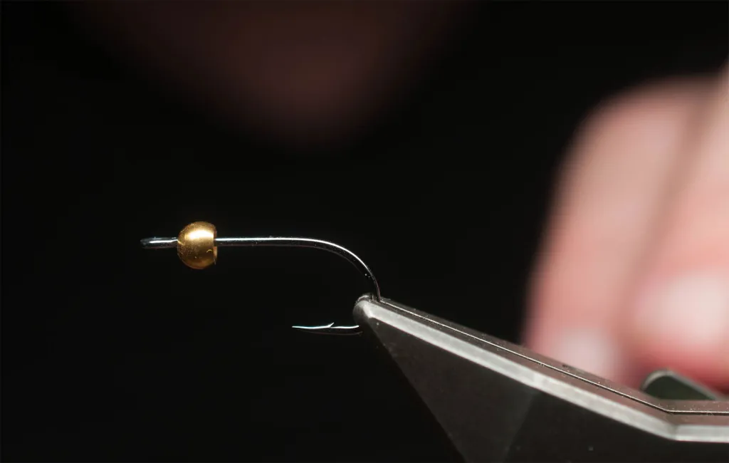 Pass the bead over the hook point and up the bend, so that it ends up with the hollow side pointing rearwards