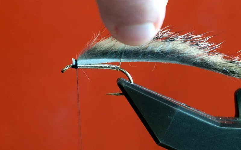 Start ribbing by pulling up the rib on the back of the fly and taking one perpendicular turn through the zonker strip