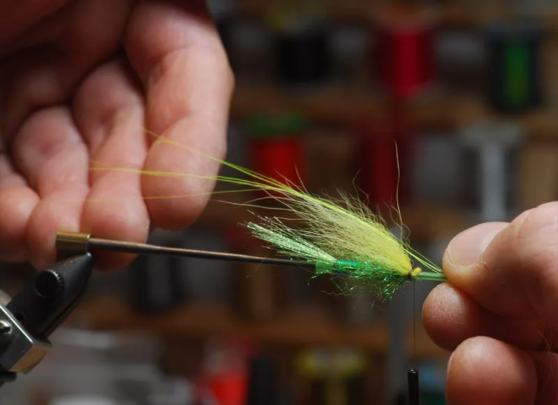 When the underwing is ready, tie in a sparse bunch of Angel Hair on top of it. Tie it in in the center and fold it back - it's easier and more durable