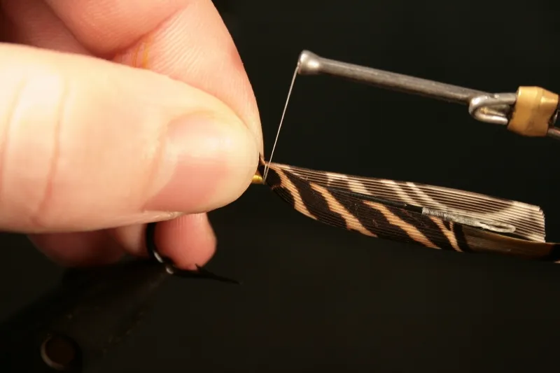 Place them back by back on top of the hook shank. Make a tread loop and tie down the fibers while you hold them with your left hand to make sure they stay on the top.