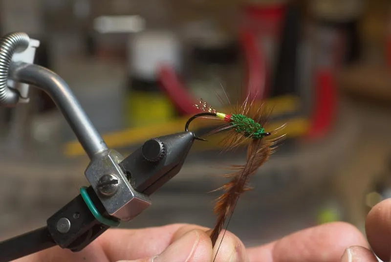 Wind the hackle forward, burying the stem in the deer hair and taking care that the hackle tips poke nicely and evenly away from the fly.