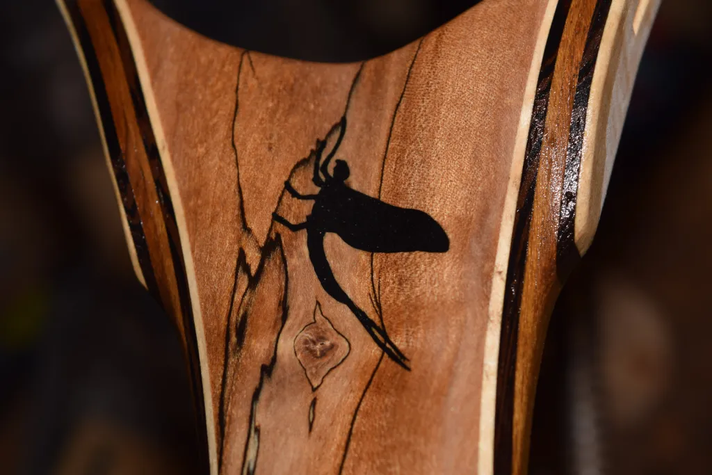 Step 3 - The finished mayfly inlaid in black stone to match the natural spalt lines