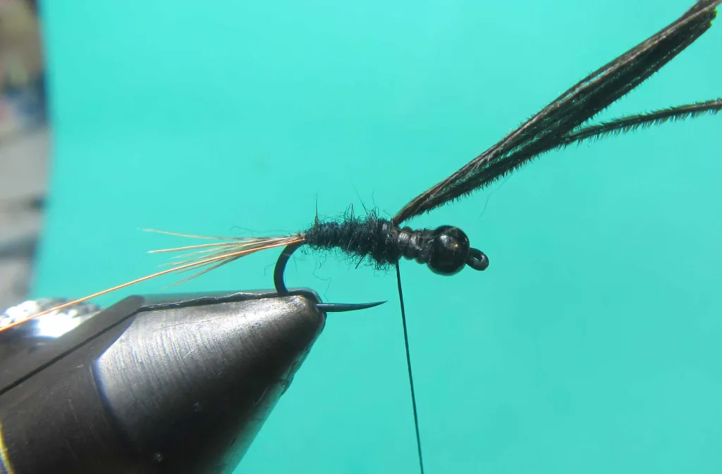 Wrap the herl forward two thirds of the shank and tie down. Leave the butts