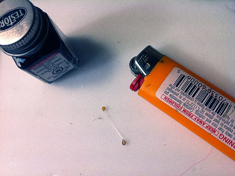 Burn a piece of thick mono to form eyes. Color them black with varnish if you want black eyes
