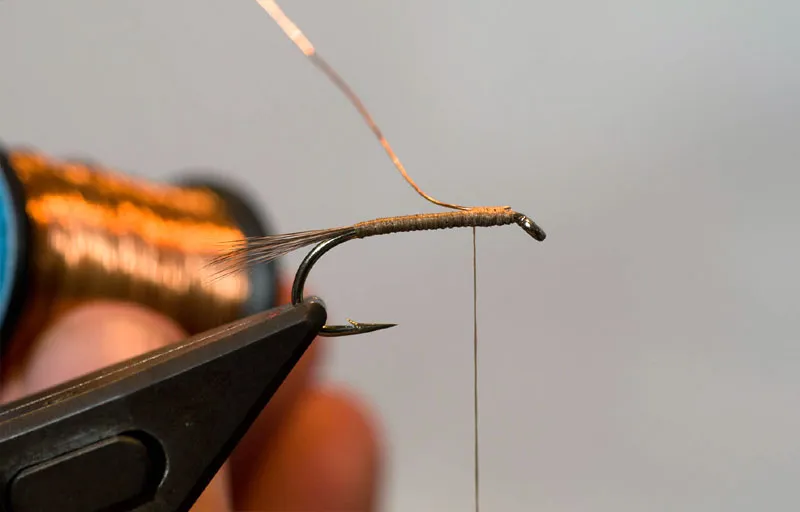 Wind the thread back to the front in tight, touching turns and tie in the copper wire