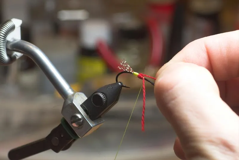 Wind the wool back and forwards again and fold the surplus end forward over the newly formed tag. Tie down and trim.