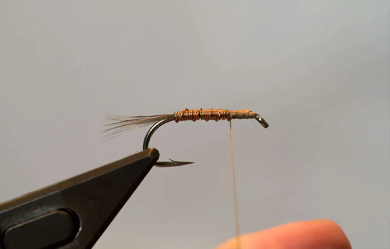 Tie down the copper and wiggle it a bit to break it. Cover the tag. If you want to varnish the fly, this is the stage where you do that. Cut the thread, varnish and set it aside while you start a new fly.