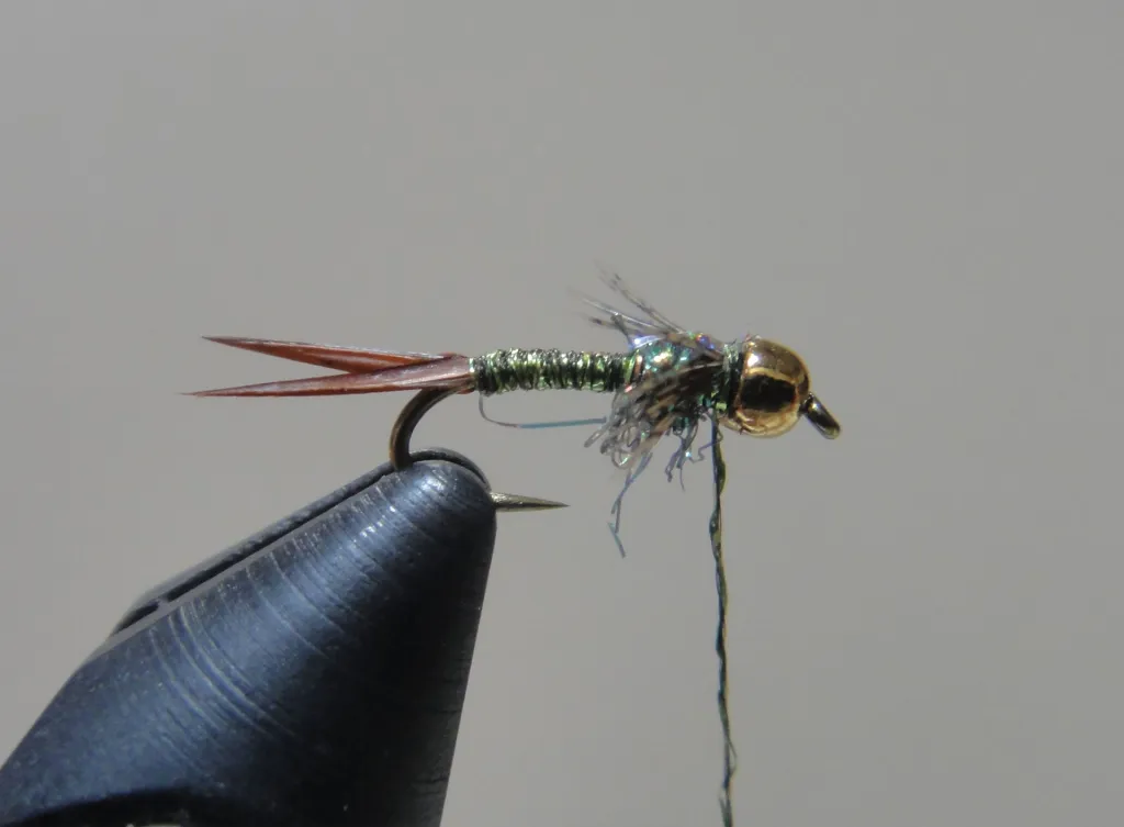 Pull the two pieces of flash over the thorax and tie them off. Clip the excess.