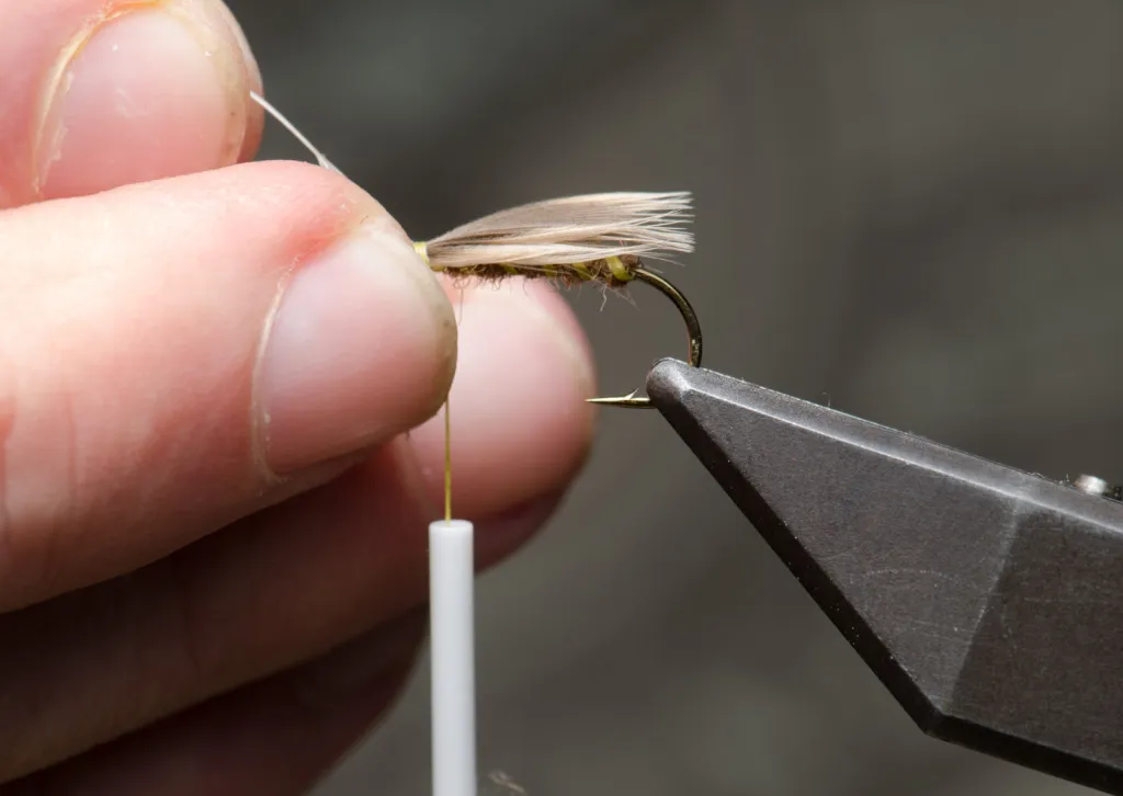 Pull on the stem while holding on the wraps and make the feather collapse and create a narrow, roof shaped wing flush with the hook bend