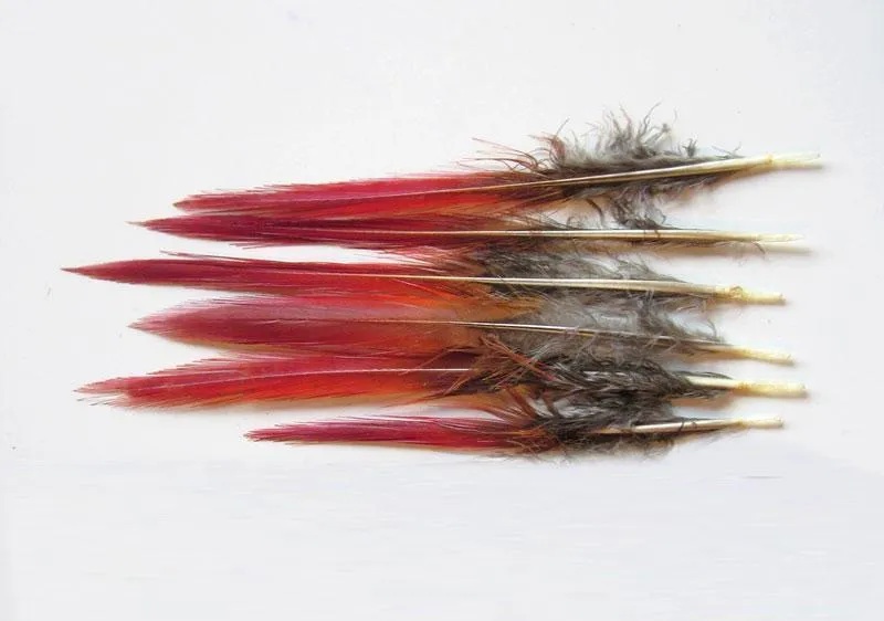 Very regular and stiff, brightly red feathers from the tail of the golden pheasant