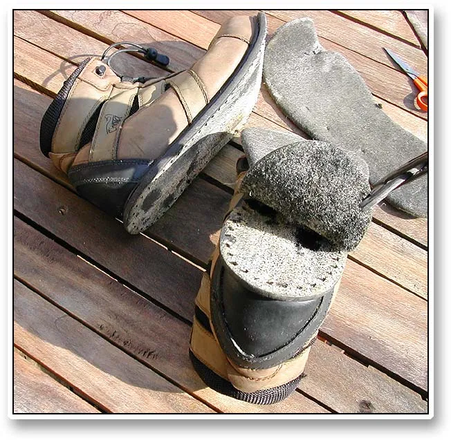 To tear off the old soles you need to apply a bit of mild violence. They will mostly be cooperative. The soles on my Chota boots had originally been sown as well as glued, but the stitches were worn through and were pulled through the felt as I slowly worked off the soles with a set of heavy pliers.