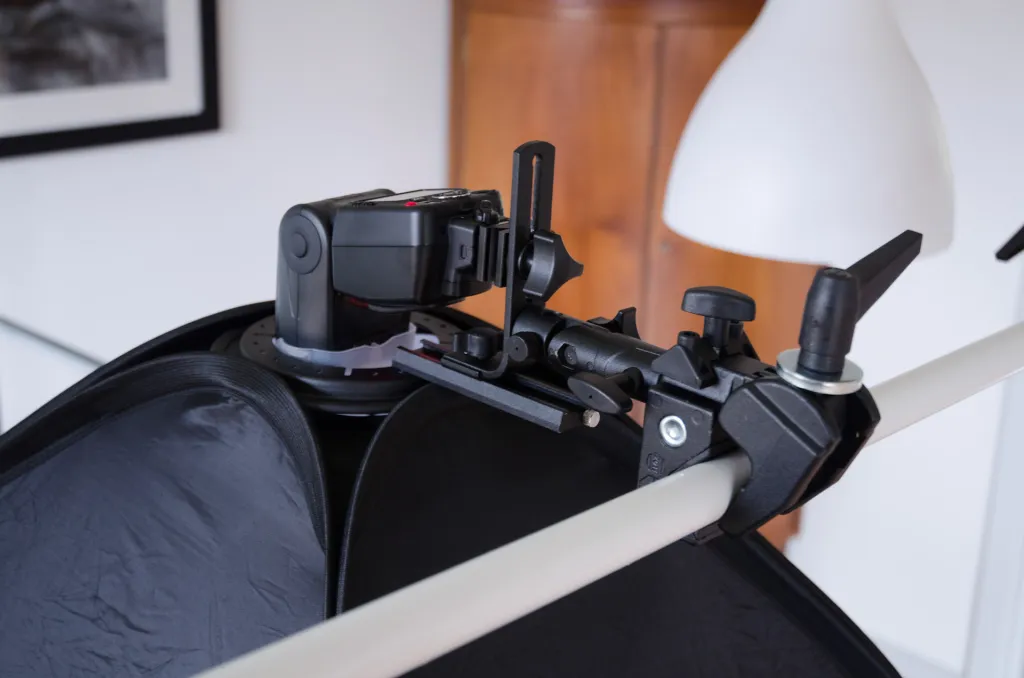 A Super Clamp holds the bracket for the lightbox, which again holds the flash