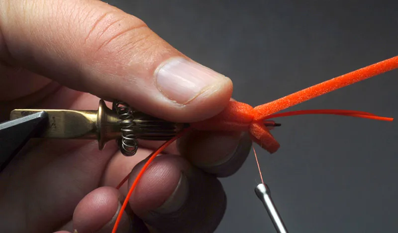 Tie down the foam in the front. Hold tight on the foam to keep it from rotating and make sure it does not deform or fold under the thread, but just compresses.