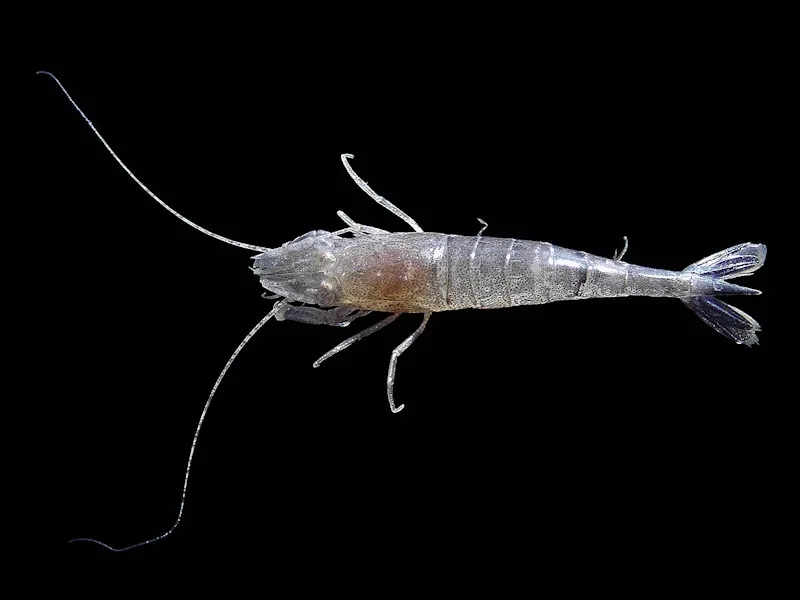 This top view shows the general body shape as well as the shape of the fan tail, which is common to most shrimp