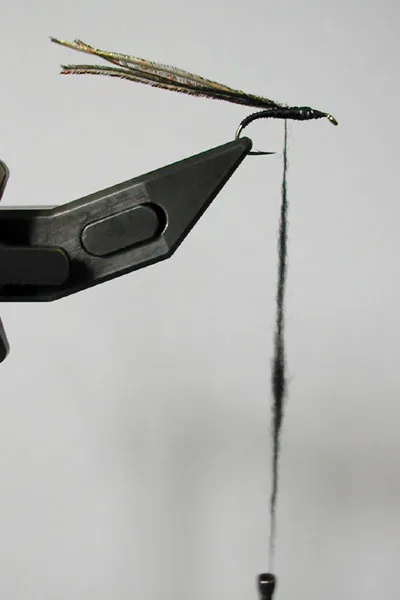 The original Darth Vader Nymph has a weighted body, which is covered with dubbing and has peacock herl as a wing case.