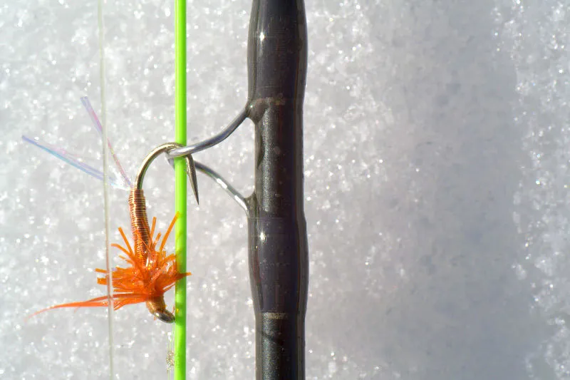 We like bright flies in the winter, and Klympen can easily be converted to a bright, orange fly using flash and chenille and an orange hackle